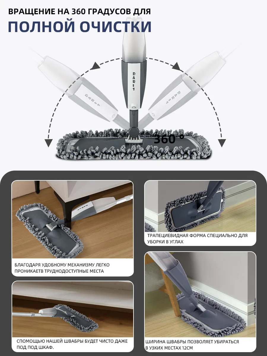 Эта швабра создана для тех, кто ценит удобство. Уборка теперь — без наклонов, без тряпок и тазиков: просто нажимаете на ручку, и вода равномерно распыляется по полу. Это быстрый, чистый и гигиеничный способ навести порядок в доме.