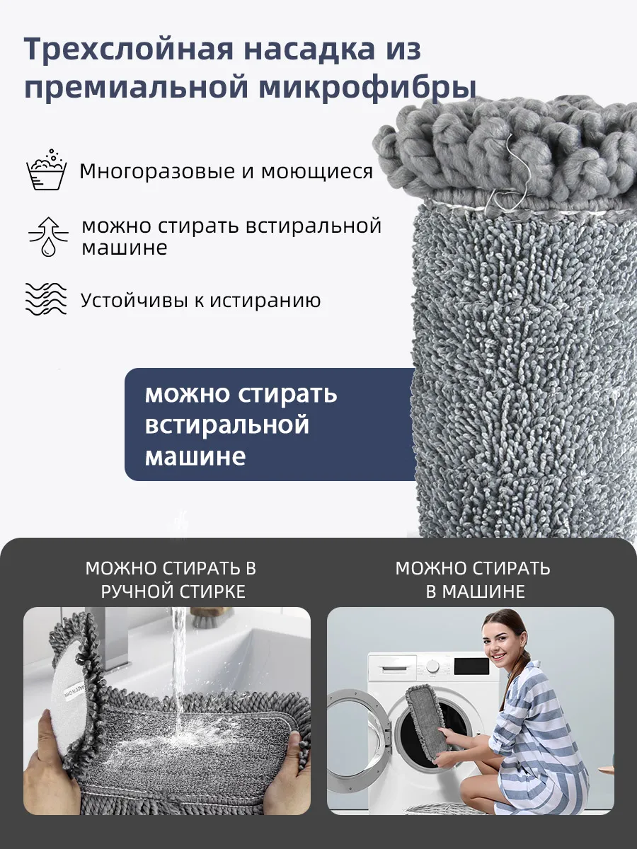 Надёжная металлическая ручка, прочный пластик и износостойкая конструкция — всё прослужит долго даже при частом использовании. В комплекте 3 микрофибровые насадки, которые можно стирать до 100 раз, экономя на расходниках.