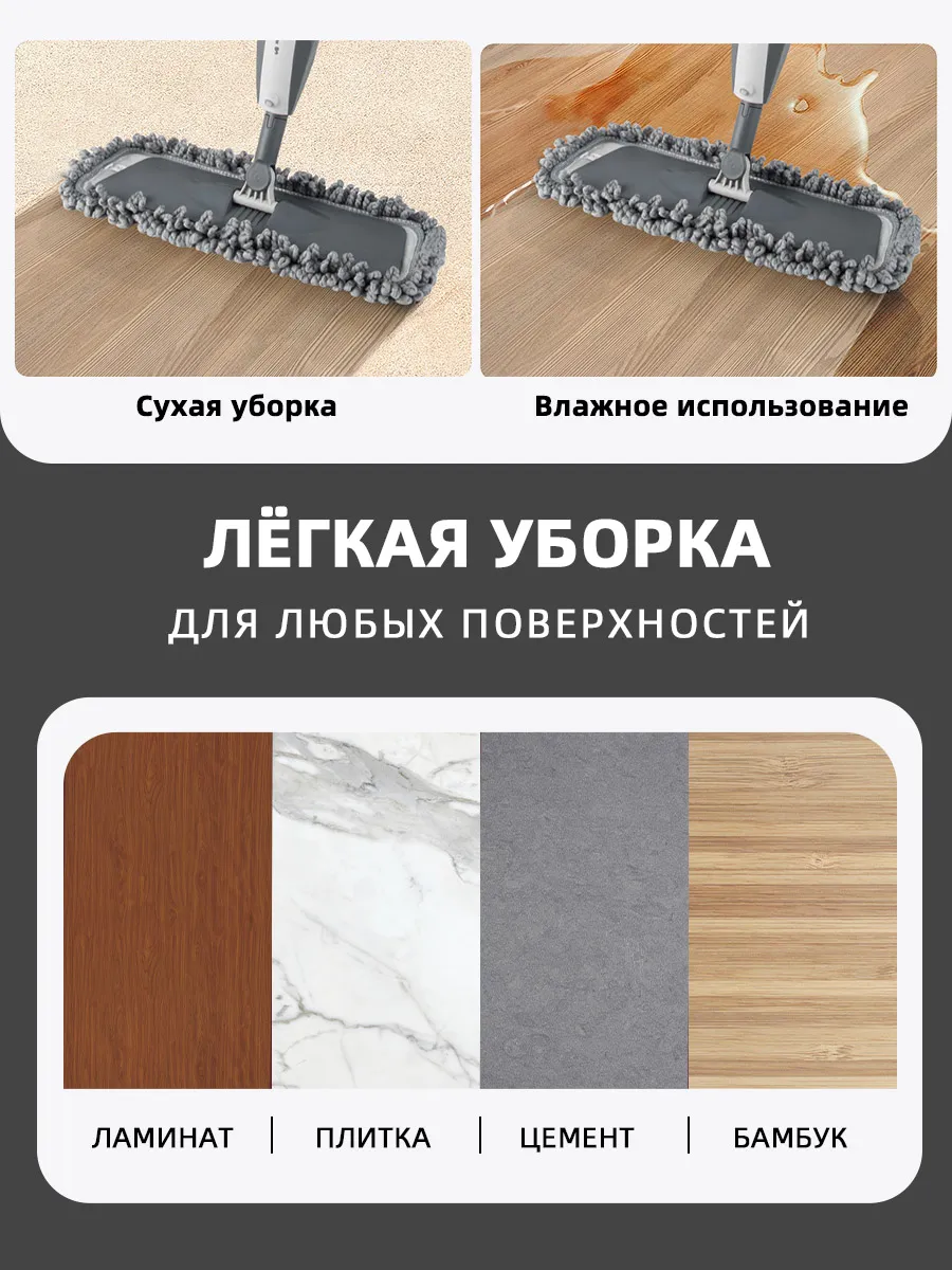 Эта швабра создана для тех, кто ценит удобство. Уборка теперь — без наклонов, без тряпок и тазиков: просто нажимаете на ручку, и вода равномерно распыляется по полу. Это быстрый, чистый и гигиеничный способ навести порядок в доме.